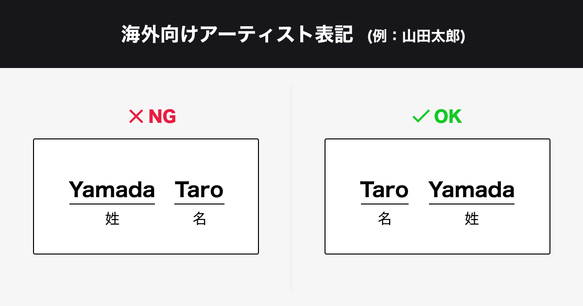 アーティスト名が、名字と名前(姓と名)の場合は、海外向け表記の順番に注意しましょう。