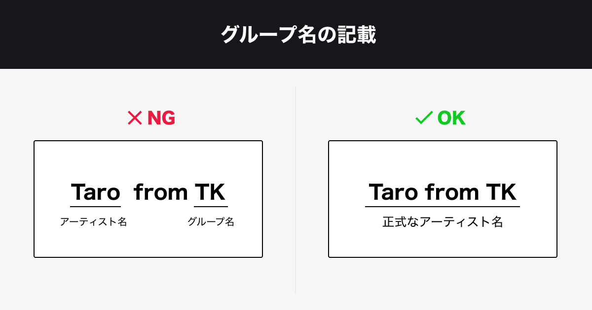 例) 国内向けのアーティスト表記が「太郎」の場合、カナは「タロウ」なのか「タロー」なのか。海外向けのアーティスト表記は「Taro」なのか「Tarou」なのか。整合性のあるように事前に正式に決めておきましょう。