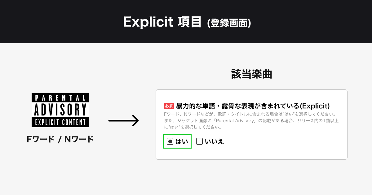 Explicitな表現を含む作品タイトル、楽曲タイトル、歌詞は、Explicitとして登録する