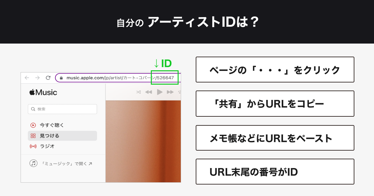 各サブスクではアーティストごとに固有のID(番号)が割り振られています。そして、それに応じてアーティストそれぞれのページが作られます。そのIDを知っていると、アーティストの紐付けが正しくない時(マッピングエラー)の修正リクエストもスムーズに伝えることができるでしょう。